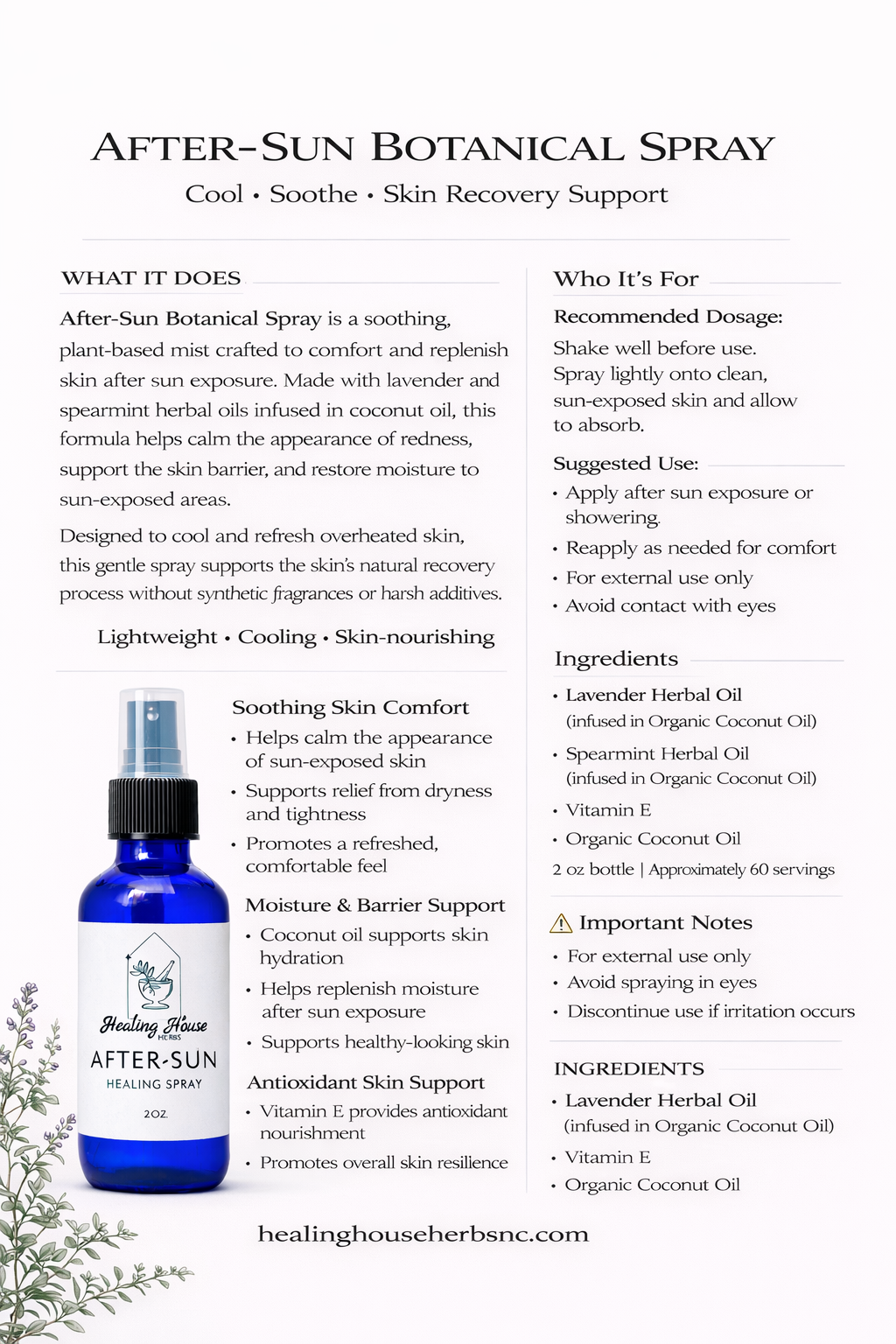 After-Sun Botanical Spray is a soothing, plant-based mist crafted to comfort and replenish skin after sun exposure. Made with lavender and spearmint herbal oils infused in coconut oil, this formula helps calm the appearance of redness, support the skin barrier, and restore moisture to sun-exposed areas.