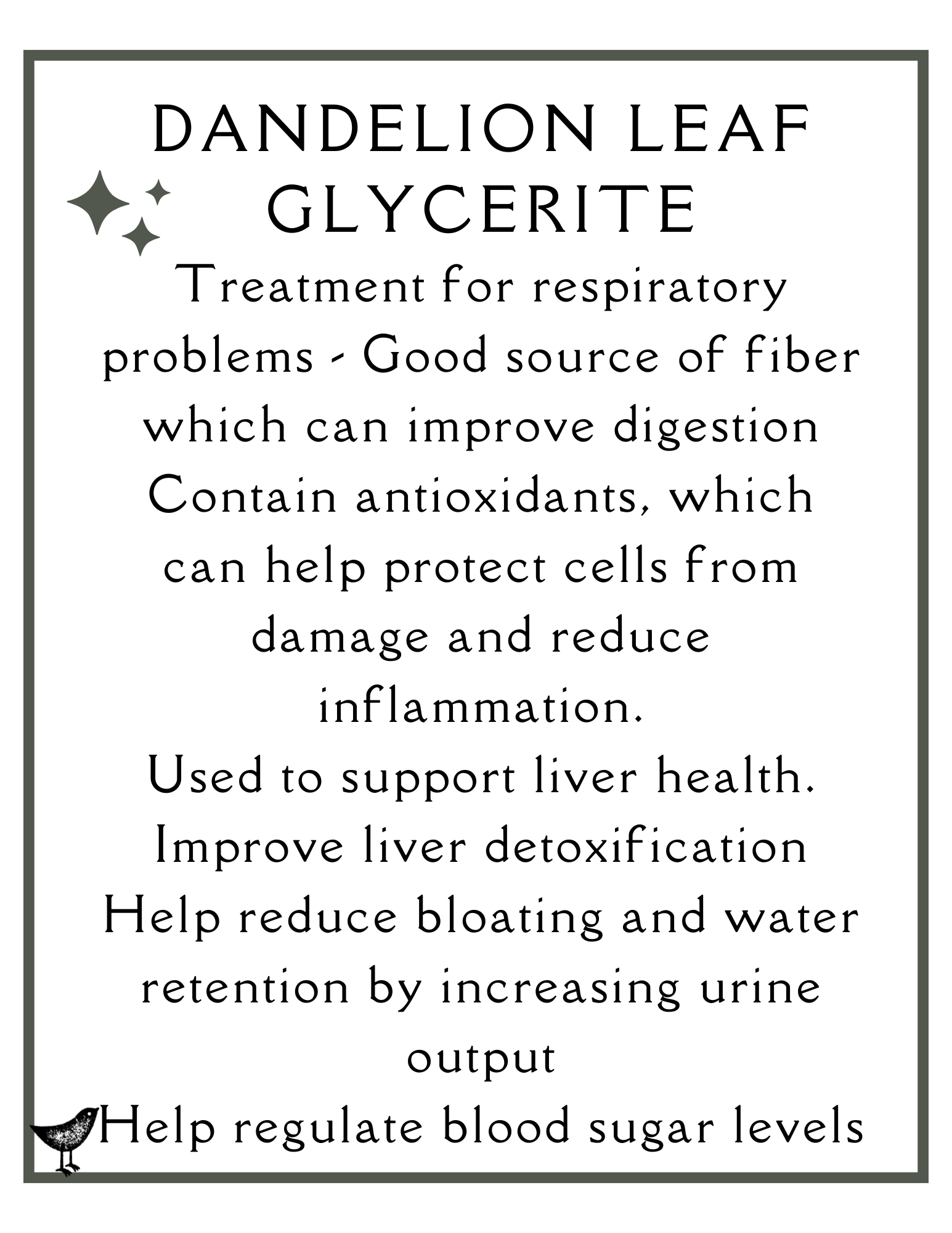 Ingredients: Organic Dandelion Leaf, Coconut-Derived Vegetable Glycerin Base, Distilled Water