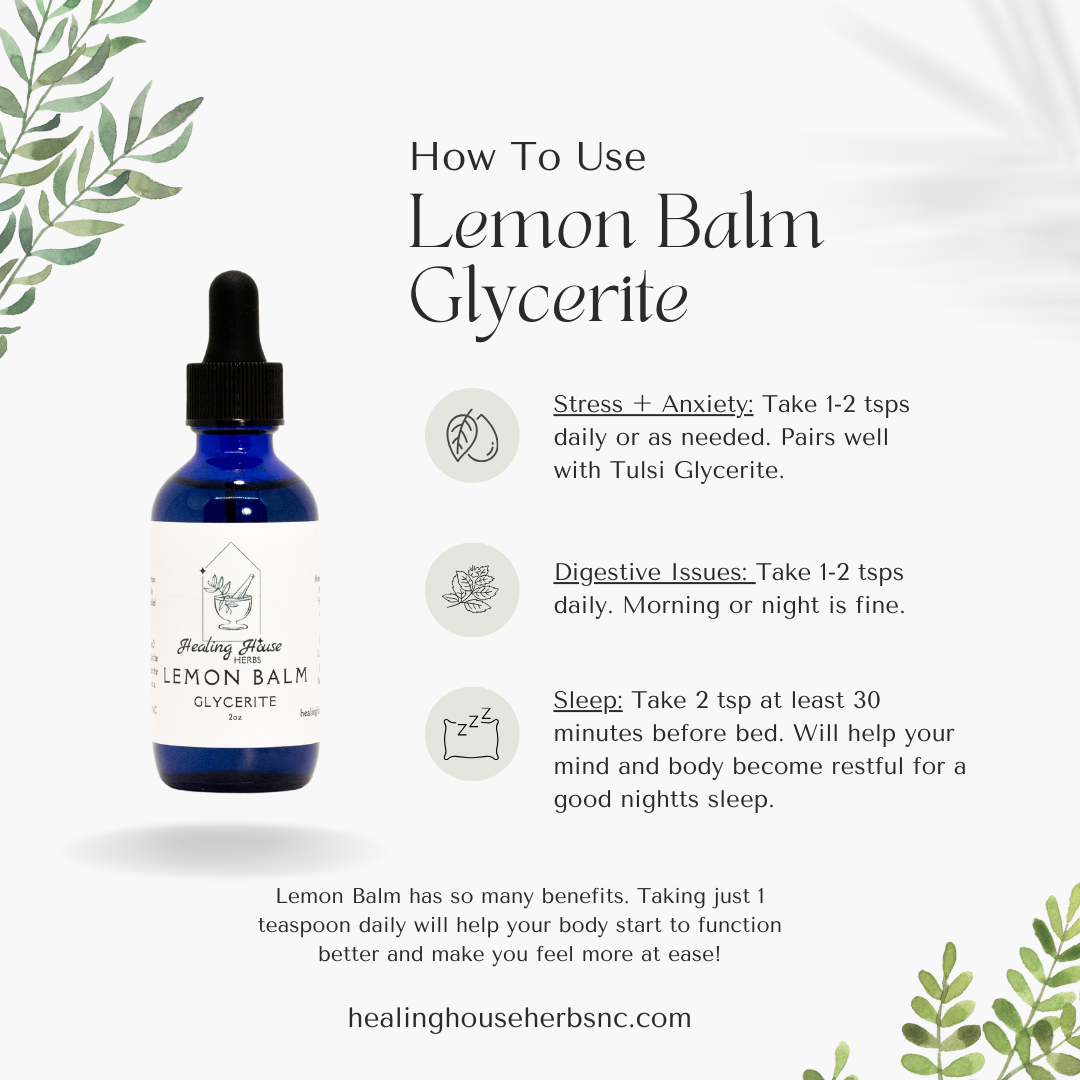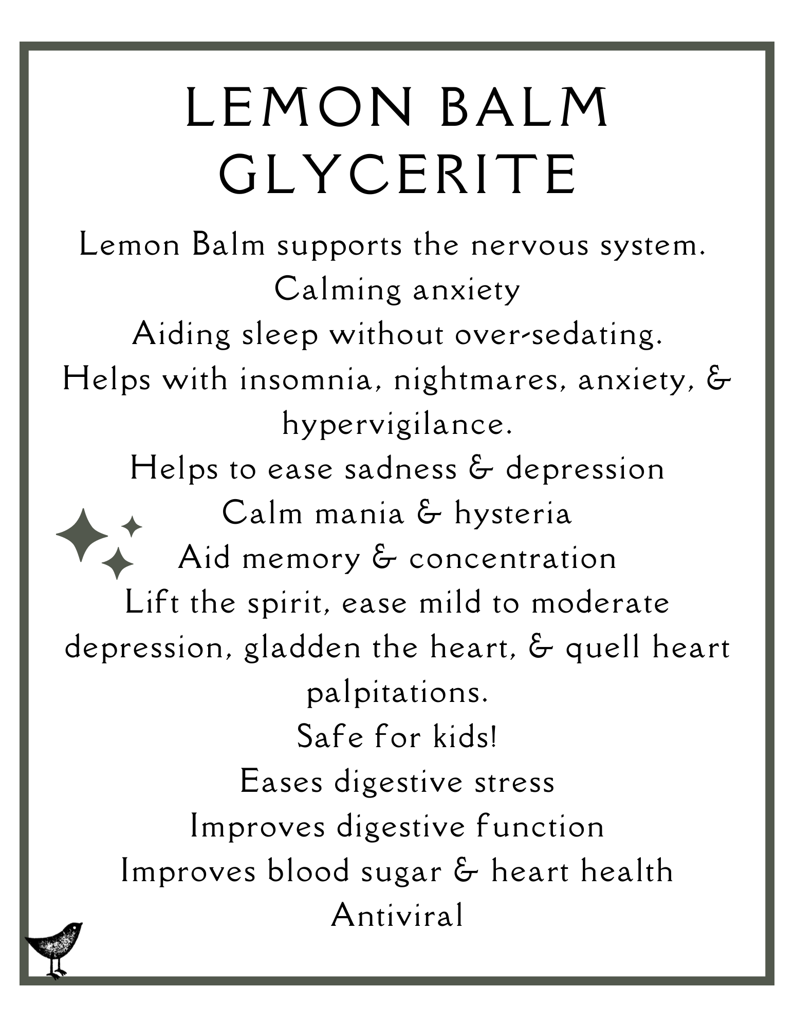 Ingredients: Garden-Grown Lemon Balm, Coconut-Derived Vegetable Glycerin Base, Distilled Water