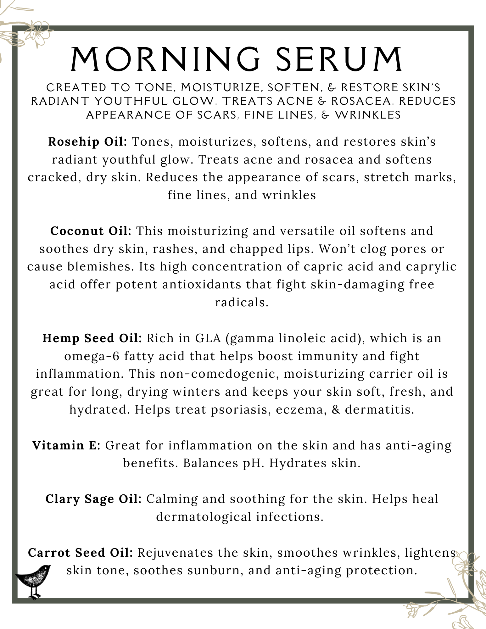Hemp Seed Oil: Rich in GLA (gamma linoleic acid), which is an omega-6 fatty acid that helps boost immunity and fight inflammation. This non-comedogenic, moisturizing carrier oil is great for long, drying winters and keeps your skin soft, fresh, and hydrated. Helps treat psoriasis, eczema, & dermatitis.