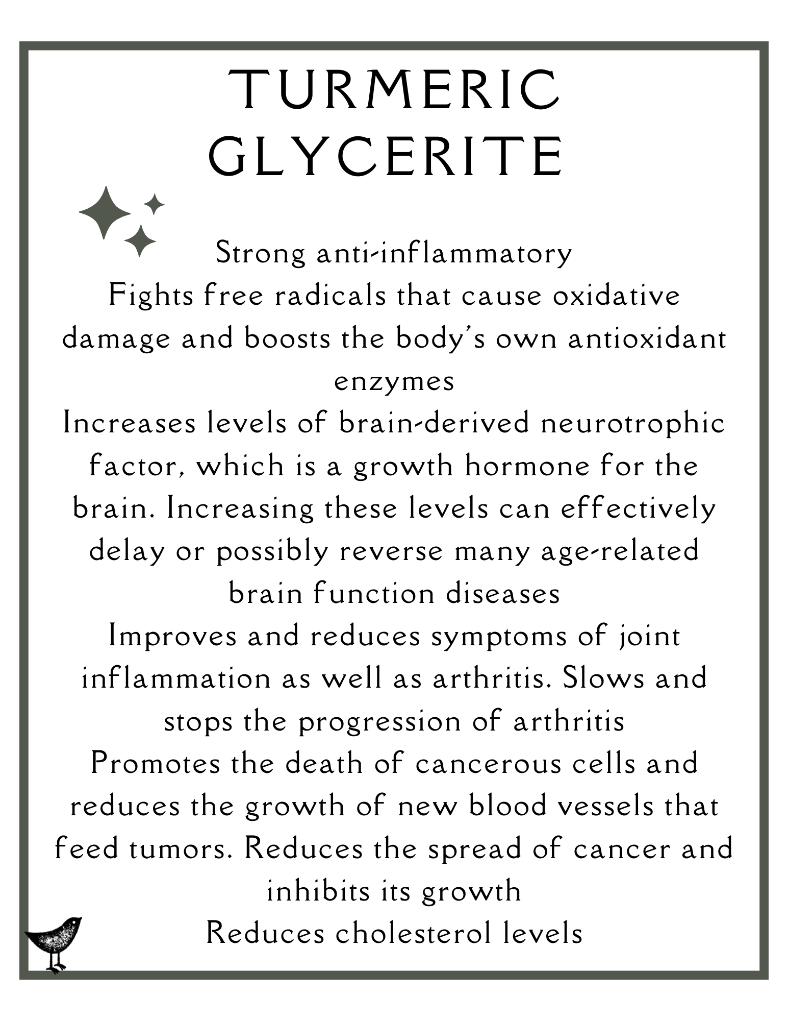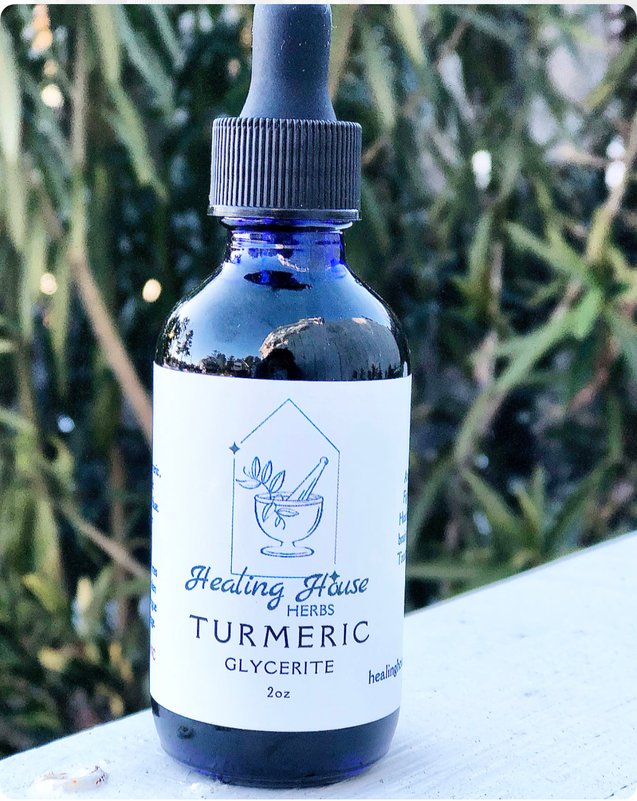 The Turmeric essence is extracted by using an organic vegetable glycerin base. The process takes about 6+ weeks. Glycerin is gentle for children and adults. Sweet to the taste but still highly effective of pulling out the medicinal benefits of the plant!